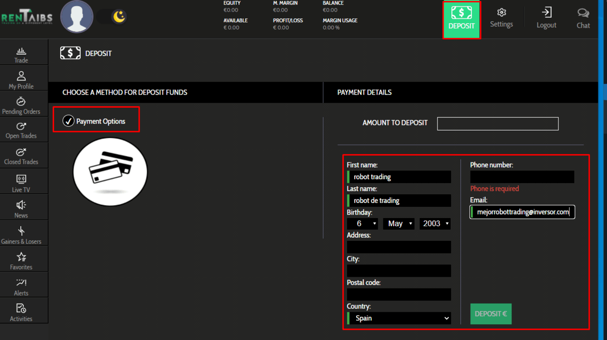 Una vez estamos dentro de la plataforma, procedemos a completar la información de nuestro perfil y realizamos el depósito de la cantidad que queramos invertir.