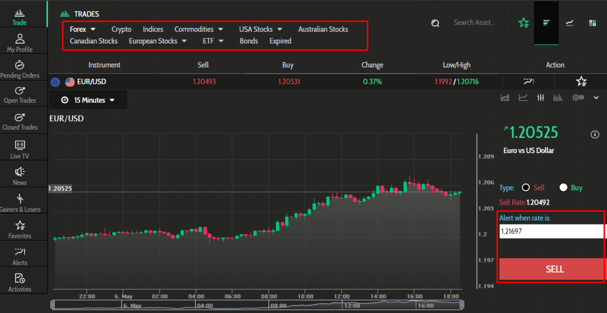Por último, en el menú de la izquierda tenemos diferentes opciones. Si accedemos en «Trade» se desplegarán todos los mercados en los que podemos comenzar a operar.